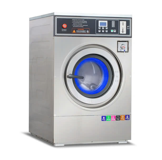 Máy giặt công nghiệp 25kg làm nóng bằng điện hoặc hơi nước. Với cấu trúc giảm xóc treo cơ học, tiếng ồn thấp, đứng tự do.